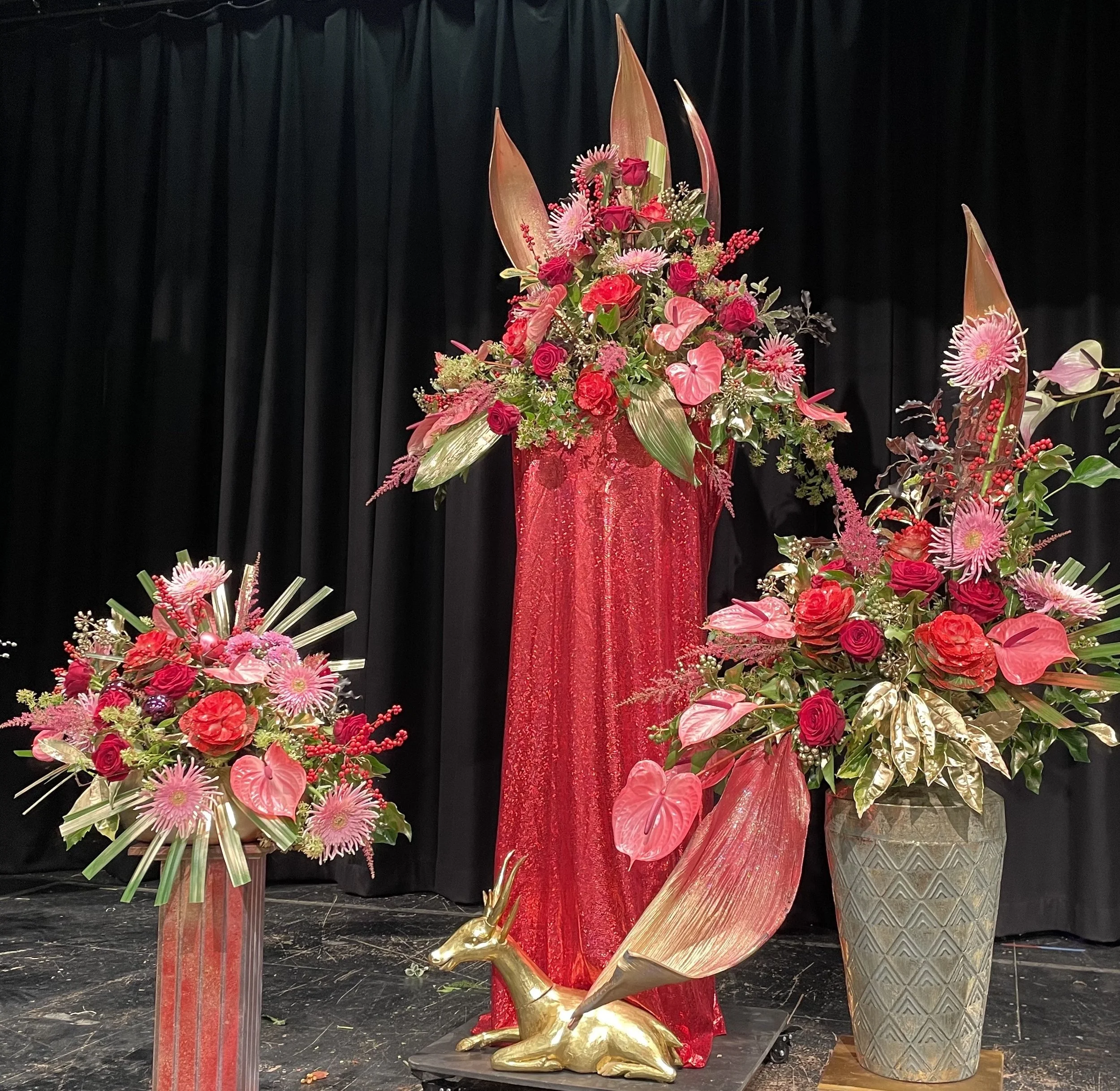 Design 5. Set into a gold urn topped with oasis this globe shaped design was bold & striking. Green foliage of trimmed palm, curled aspidistra leaves, gold sprayed Aucuba japonica – berry headed holly & Mini cabbage heads with scattered purple pittosporum set off the dramatic pink & claret blooms. Displayed flowers included abelia, tall red ilex berries, pink spray chrysanthemums, fluffy pink astilbe and scented Naomi red Roses. Striking pink/red Anthurium ‘Candy’ added drama with the final touch spidery edged pink Gerbera ‘Emma’ created an asymmetrical flow to one side.
